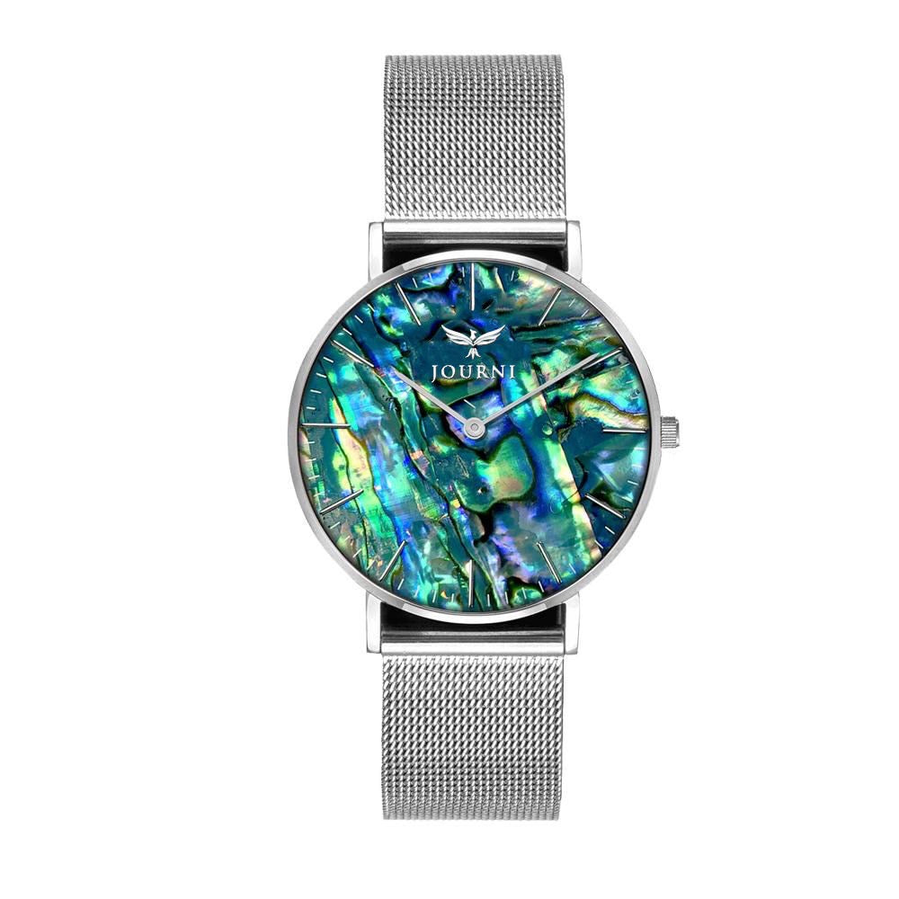 The Harmony Wave features a dial crafted from genuine Abalone Shell, celebrated for its iridescent ocean-inspired patterns. Abalone is known as a gemstone of intuition, emotional balance, creativity, and aura protection, carrying the calming energy of water wherever you go.